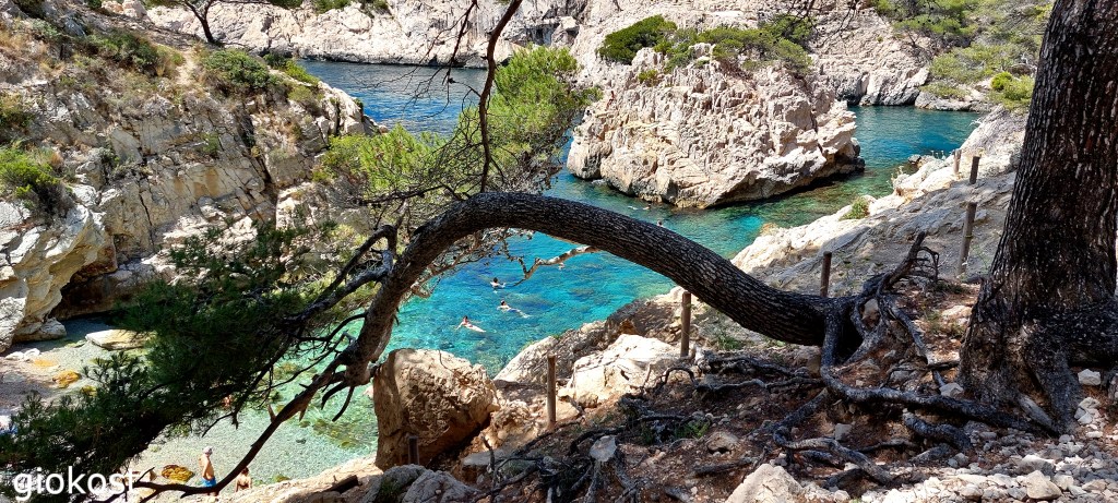 Prediligendo invece camminare si può partire da Marsiglia, meglio dal campus universitario di Luminy raggiungibile in auto, il parcheggio a sinistra dell’entrata è gratuito, oppure con diversi bus in partenza da alcune stazioni della Metro. Da qui si prende il sentiero GR6 che porta dapprima al belvedere di Sugiton, foto iniziali, un’ex torre di avvistamento, senza ombra di dubbio uno dei più belli dell’intero parco, da dove si vedono, sula sinistra il monte Puget, il più alto del parco, e la calanca di Sugiton, sulla destra la cala di Morgiou.