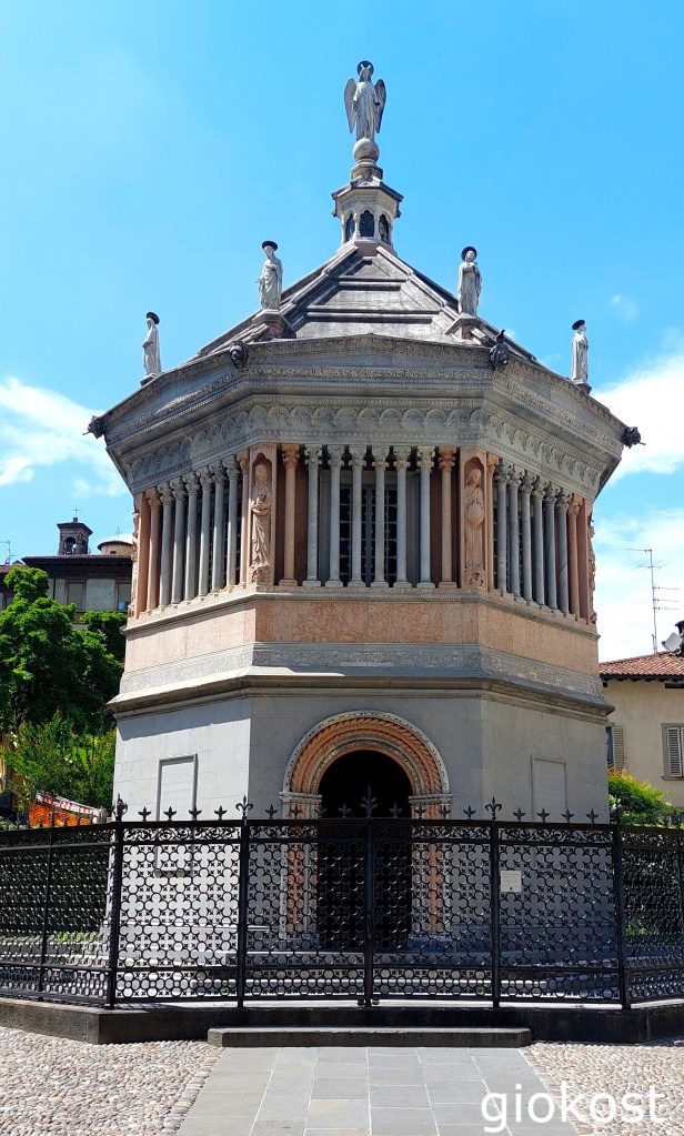 Sulla destra il Battistero, costruito nel XIV secolo all’interno della Basilica di Santa Maria Maggiore è stato spostato più volte fino alla sua collocazione odierna avvenuta alla fine del XIX secolo. Di forma ottagonale, con la statua di un angelo sulla cupola, ad ogni angolo ospita esternamente, sopra il basamento, in marmo rosso, le statue della quattro Virtù cardinali: Giustizia, Prudenza, Fortezza e Temperanza, con l’aggiunta di altre tre: Fede, Speranza e Carità, l’ultima è quella della Pazienza intervallate da otto colonnine.