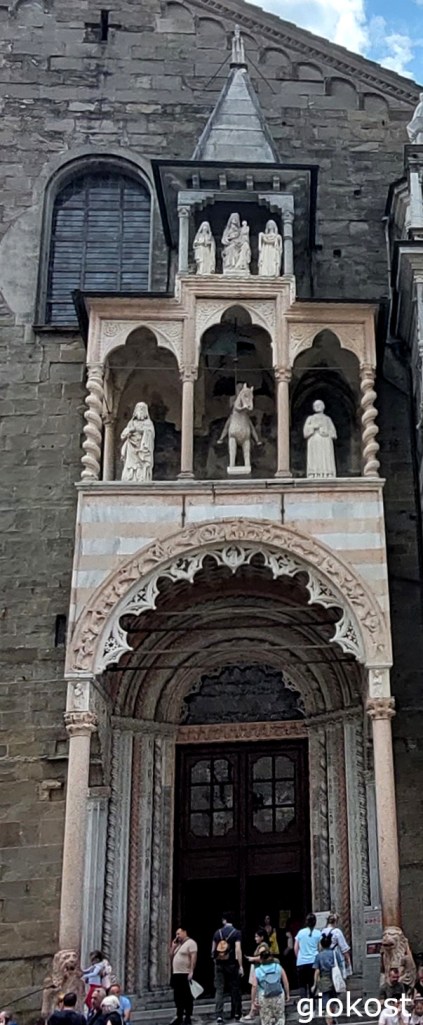 Di fronte al porticato si apre la porta d’entrata della Basilica di Santa Maria Maggiore. Venne costruita, sopra una chiesa del VIII secolo, nel 1137 come voto alla Madonna affinché proteggesse Bergamo dalla peste. Dopo molte ristrutturazioni, avvenute nei secoli seguenti, ha preso l’aspetto odierno nel XVII secolo. La facciata non è unica, infatti, non esiste un solo portale d’ingresso ma tre, uno a nord, su piazza Duomo, caratterizzato, ai lati, da leoni color rosso, un’altro verso sud con leoni bianchi e il terzo, sempre a sud, lateralmente, in corrispondenza della fontana di Antescolis. I primi due sono sormontati da protiri, ovvero un portico che protegge l’entrata.