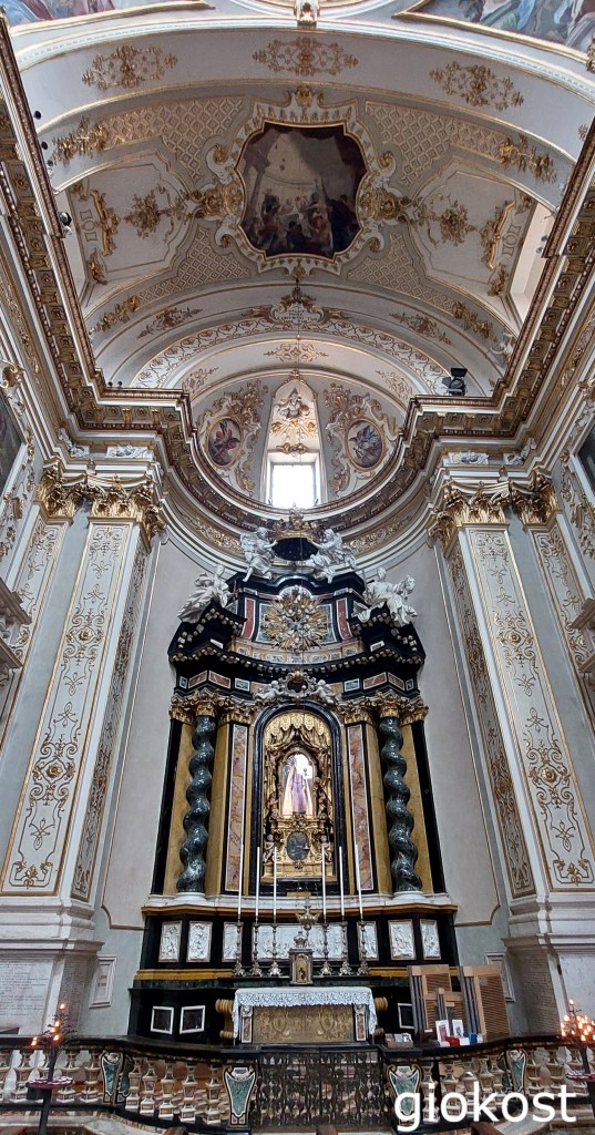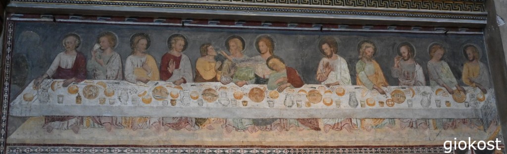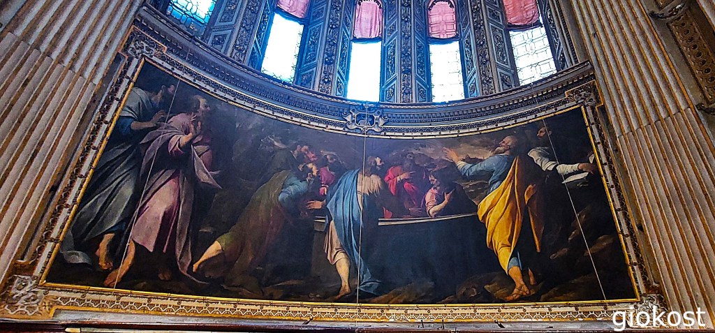 Il presbiterio si completa con l’altare maggiore, in marmo bianco e soprattutto con la tela, absidale concava, di Camillo Procaccini, gli Apostoli al sepolcro della Vergine, e con un soffitto dove ci sono quattro medaglioni che raffigurano alcune scene della vita di Maria. Il transetto a sinistra ospita un ciclo di affreschi del ‘300 , in alto vediamo l‘Ultima Cena, subito sotto una scena della vita di San Eligio mentre ferra un cavallo, sulla destra altri due Santi, la composizione è poi completata da una serie di Madonne con Bambino e dallo sposalizio di Santa Caterina, si tratta di dipinti votivi quindi di anni e autori diversi. Sempre sulla stessa parete una tela seicentesca che raffigura Mosè che fa scaturire l’acqua dalla roccia.