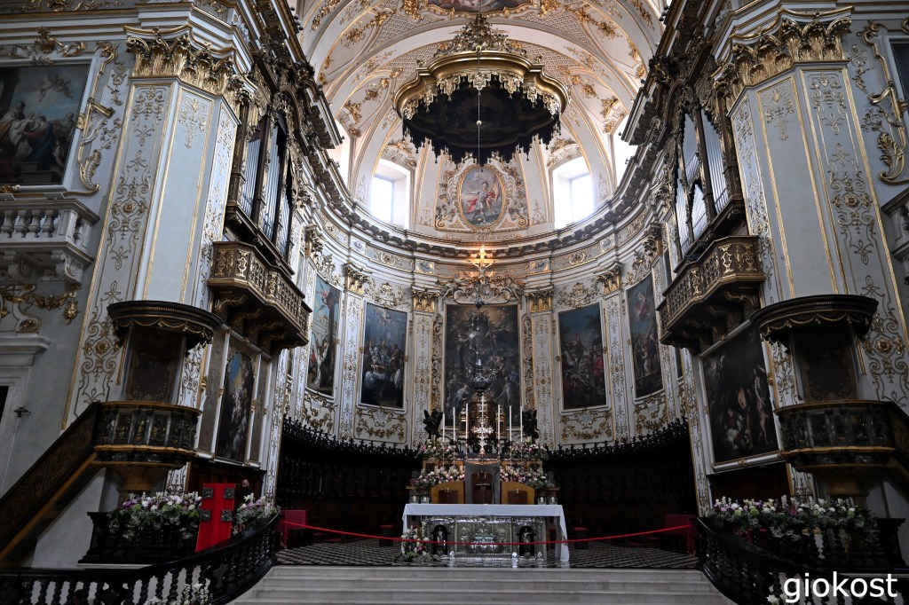 Alzando lo sguardo si ammirano sette dipinti che compongono l’abside con al centro il martirio di Sant’Alessandro di Nicola malinconico, pittore dell’epoca barocca, sulla sinistra un capolavoro di Giovanbattista Tiepolo, il Martirio di san Giovanni vescovo. L’abside è ornata con un prezioso coro in legno di noce realizzato verso la fine del XVII secolo da Gian Carlo Sanz, è composto da 44 seggi intervallati da cariatidi che riproducono le virtù, la ventiduesima è il ritratto dell’autore, in alto degli angioletti completano la ricchezza ornamentale. Al centro del coro c’è la cattedra vescovile composta da un baldacchino ed un inginocchiatoio decorati con scene riguardanti i compiti pastorali.