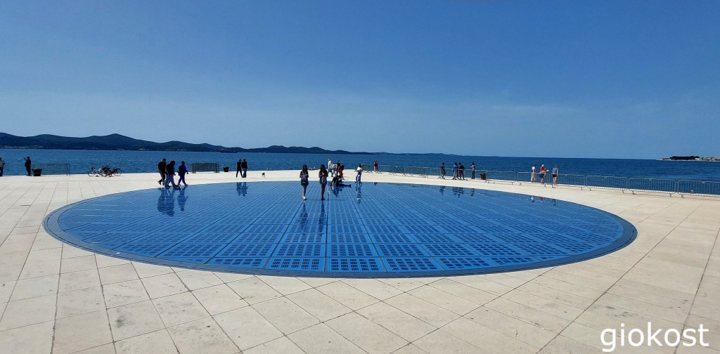 La seconda, a poca distanza, è il Saluto al Sole, un grande cerchio dal diametro di ventidue metri formato da trecento pannelli fotovoltaici che accumulano la luce diurna per poi liberarla di sera creando effetti luminosi spettacolari. Fermandosi al tramonto, si può godere di una scenografia fatta di colori e suoni fantastici. Entrambe queste strutture sono opera dell’architetto Nikola Bašić.
