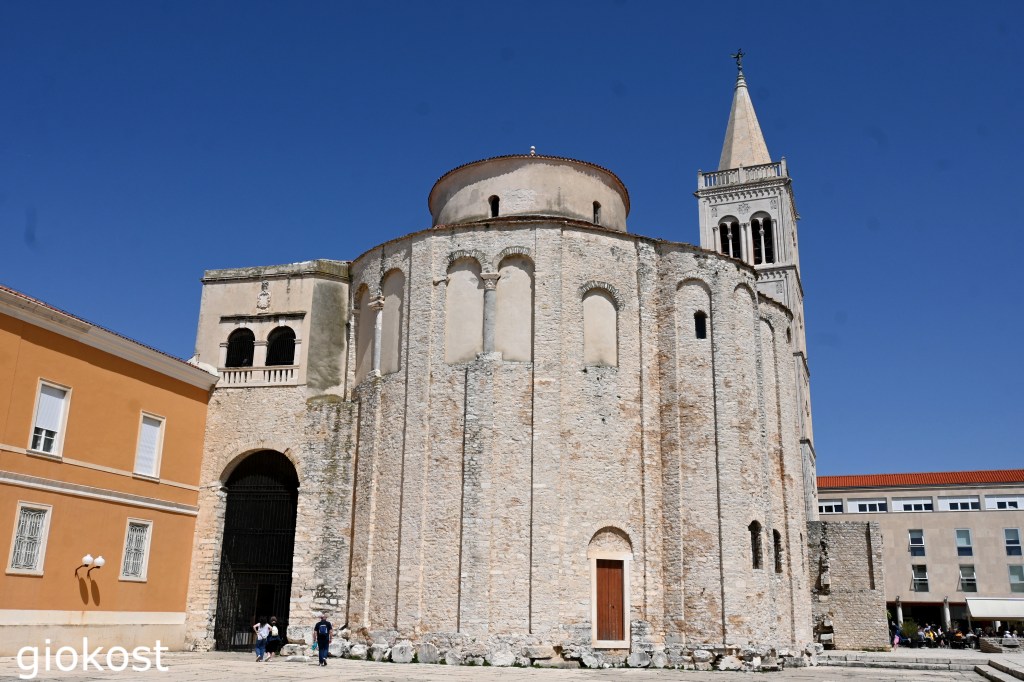 In poco tempo si arriva alla Cattedrale di Sant’Anastasia. Edificata, in stile romanico in due momenti nei secoli XII e seguent,e anche se la porzione più antica è di tre secoli precedenti, eretto su una basilica paleocristiana. La facciata, splendidamente decorata, è divisa in due ordini, inferiormente ci sono tre portali, sopra quello al centro si vede un bassorilievo raffigurante la Madonna con Bambino fra i Santi Crisogono ed Anastasia, superiormente un frontone con un rosone. Il campanile costruito nel ‘400 e terminato quattro secoli più tardi è in stile neoromanico e salendo sulla cima si ha una notevole vista sui tetti del centro storico di Zara, Internamente le tre navate presentano dei colonnati con capitelli corinzi, nelle absidi degli affreschi duecenteschi, in quella di sinistra le reliquie di Sant’Agata e nel presbiterio un coro ligneo del’400 ma quello che attira l’attenzione dei visitatori è il Polittico di Zara che si trova nel Museo della chiesa.