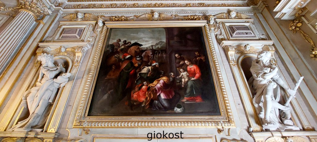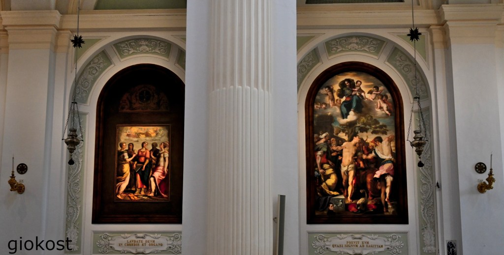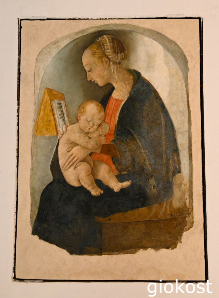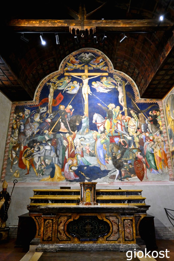 Sulla parete di sinistra due Madonne con Bambino, la prima detta Madonna del Paradiso è affiancata dai santi Girolamo e Giovanni Battista, la seconda detta dell’Umiltà dai santi Sebastiano e Battista, tutto sotto un soffitto ligneo a carena di nave di una navata unica. La mia attenzione è stata però subito attirata dalla straordinaria Crocefissione dove emerge immediatamente il dramma della scena che si coglie nella disperazione della Maddalena e dei personaggi che si muovono attorno alla Croce, ma il capolavoro di tanta tragicità è l’uccello che nutre i suoi piccoli con il sangue che fuoriesce dalla ferita sul petto.