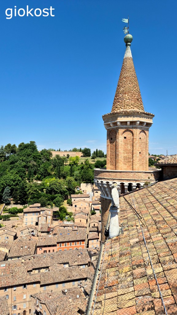 Come descritto in precedenza da Porta Valbona seguendo via Giuseppe Mazzini si arriva direttamente in piazza della Repubblica il centro della città, qui si uniscono i due colli, da qui, passando davanti a Palazzo Albani, costruito nel XV secolo, si arriva all’orto botanico dell’università e alla vicina chiesa di Santo Spirito dove oltrepassando il portale rinascimentale si deve alzare lo sguardo per ammirare, sulla volta a botte, un ciclo pittorico composto da quindici quadri, all’interno di cornici di legno, che rappresentano i Sette doni dello Spirito Santo, l’Incoronazione della Vergine, il Battesimo di Gesù e la Liberazione di San Pietro.
