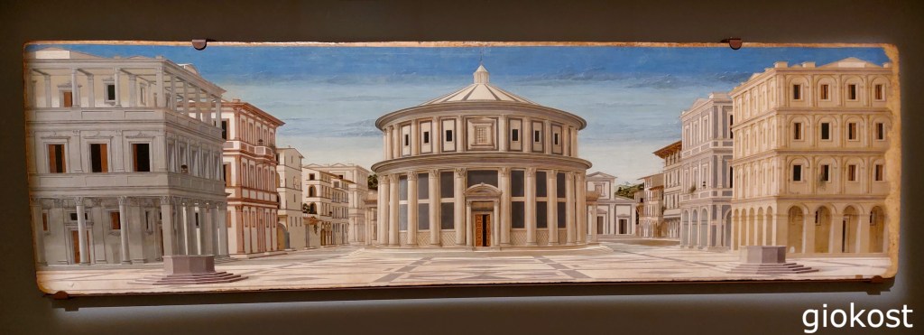 Nella sala adiacente si vede un’altra opera prestigiosa la città ideale, opera di un artista ignoto, proviene dal monastero di Santa Chiara di Urbino e risale agli ultimi anni del XV secolo. Nel dipinto si vede una piazza con edifici e due pozzi ai lati, al centro una grande edificio somigliante ad un battistero e sullo sfondo un paesaggio collinare, non c’è segno di presenza umana, guardando con attenzione ci sono due piccioni sul cornicione del palazzo di destra.