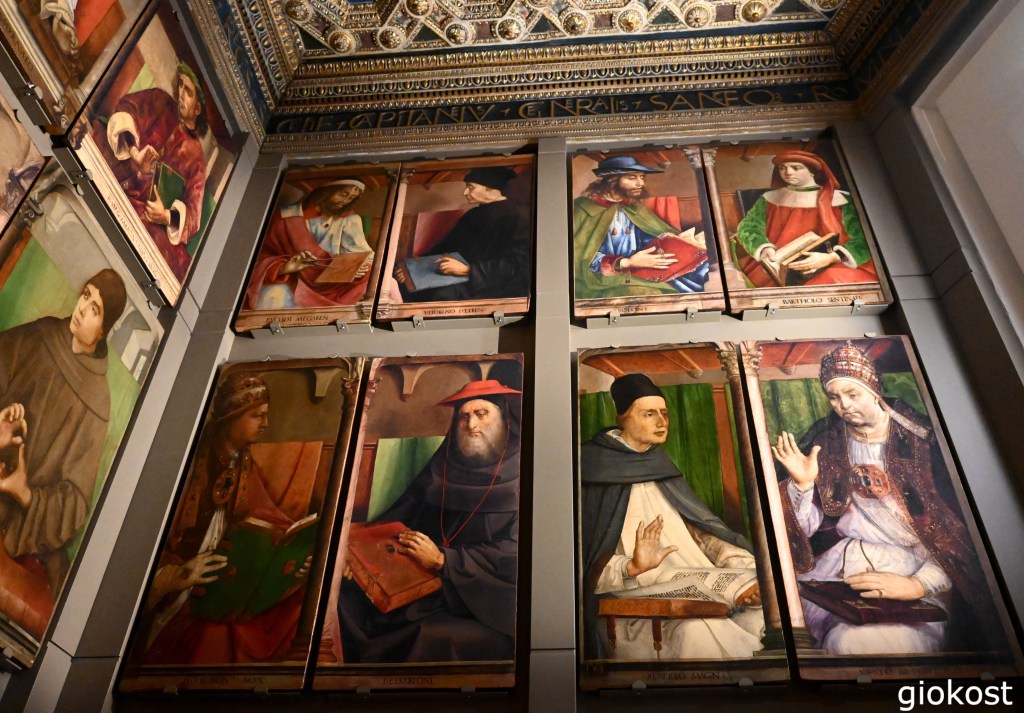 Si trova nel cuore del palazzo, al piano nobile, all’interno dell’appartamento del Duca, la sua realizzazione, ad opera di artisti fiamminghi, è datata 1446, data che appare sotto il soffitto a cassettoni. Nella parte superiore, su due registri, le pareti erano decorate con ventotto ritratti di personaggi illustri, lavori di Giusto di Gand e Pedro Berruguete, si riconoscono Platone e Aristotele, Dante e Petrarca, Cicerone Seneca e Virgilio, Mosè e Salomone, Sant’Agostino e Sant’Ambrogio.
