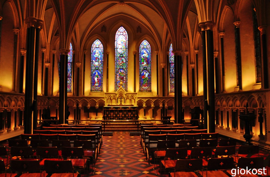 Entrando ci troviamo di fronte a tre navate maestose caratterizzate da bellissime vetrate colorate e un soffitto con volte a crociera, l’aspetto che attira maggiormente l’attenzione è però il pavimento piastrellato in cotto finemente decorato e molto colorato. Camminando verso il coro incontriamo il monumento funerario di Strongbow, secondo la leggenda potrebbe trattarsi del sepolcro di un ex re del Leinster, Richard de Clare, si tratta di un cavaliere con armatura, accanto un mezzo busto di bambino si dice che potrebbe essere suo figlio tagliato in due parti. Di fronte c’è la fonte battesimale e la tomba del vescovo Charles Lindsay. La cattedrale contiene alcune cappelle, in quella dedicata a St. Laud ovvero san Lorenzo O’Toole, il santo patrono della città che fu arcivescovo di Dublino nel XII secolo. Un tempo era esposta, in una teca in legno, una reliquia del santo, il cuore, che venne trafugato nel 2012 e ritrovato sei anni più tardi, ora lo si può ammirare sotto una teca di vetro.