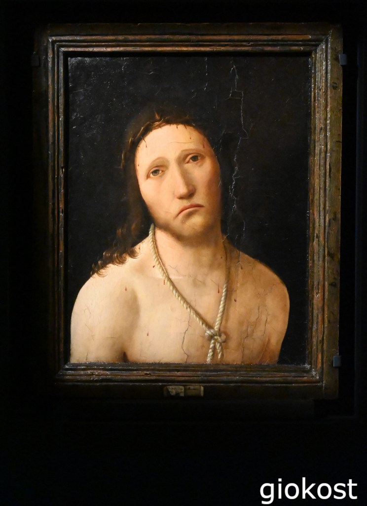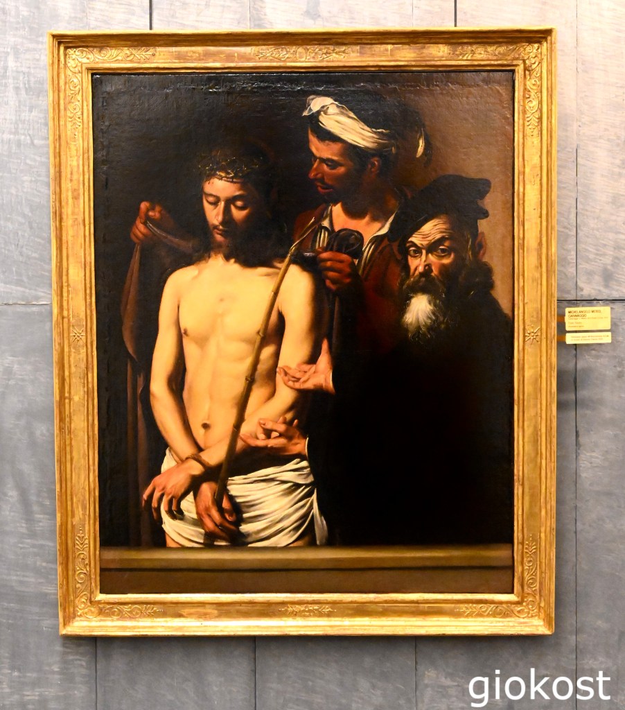 Quella che più mi ha meravigliato è l’Ecce Homo attribuito a Caravaggio dove Gesù è raffigurato con il volto chinato, il corpo coperto sui fianchi da un drappo bianco, una canna nella mano destra e la corona di spina sulla testa. Il soldato dietro di lui gli copre le spalle prima che venga esposto da Ponzio Pilato al popolo, sulla destra un altro uomo in abiti nobiliari lo indica. La tecnica del chiaroscuro, tipica di questo autore, mette in risalto il dolore e la sofferenza visibile nella postura del corpo e nel sangue che sgorga dalla corona di spine in contrapposizione con l’assenza emotiva di chi gli sta alle spalle.