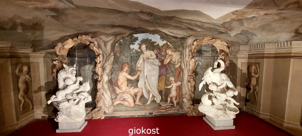La prima stanza che si incontra è la sala dei quadri, da dove, attraverso un piccolo corridoio, si raggiunge la cosiddetta “grotta”, la sala da pranzo dove, oltre agli arredi, si notano due gruppi scultorei sulla destra Giove in forma di cigno con Elena, opera di Bernardo Schiaffino e sulla sinistra Polluce e La lupa con Romolo e Remo di Francesco Biggi, al centro un affresco raffigurante il giudizio di Paride di Domenico Parodi.