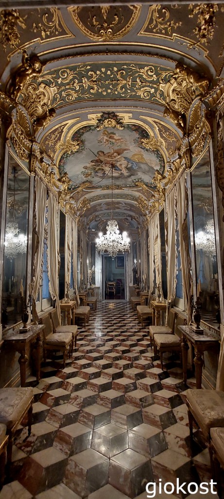 Per visitare le restanti sale dobbiamo attraversare la Galleria degli Specchi, creata già allora per suscitare stupore ed infatti le decorazioni e gli stucchi opera di Lorenzo de Ferrari creano questa illusione riscontrabile sulla volta, con Bacco, Venere e Amore al centro, il trionfo di Galatea e Amore e Pan sopra le porte, il disegno geometrico del pavimento e i riflessi degli specchi che assieme fanno sembrare lo spazio più grande di quanto sia in realtà. La visita di questo piano termina con il Salotto dei Franceschini, dove i camerieri si preparavano per il servizio e la Sala da Pranzo che lo divenne solo nell’800 perché vicina al portavivande che si trovava nella saletta accanto, prima la sala per pranzare era scelta in base al numero degli invitati.
