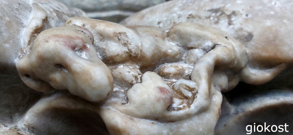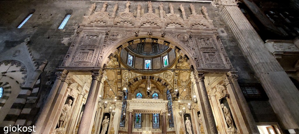 Questa strutturazione continua anche all‘interno, nello spazio tra le navate sulla cui controfacciata si osserva un’affresco trecentesco raffigurante il Giudizio Universale. Le navate sono tre, separate da un colonnato che sostengono un finto matroneo che riprende il bianco e nero dell’esterno. Iniziamo percorrendo la navata di sinistra dove troviamo la Cappella di san Giovanni Battista, un vero e proprio tesoro progettato dall’architetto Domenico Gagini e costruito per custodire le ceneri del santo portate a Genova già nel XII dopo la prima crociata. Esternamente si presenta con un grande arco sorretto da colonne dove ai lati si notano quattro riquadri che raccontano la vita di Giovanni Battista.