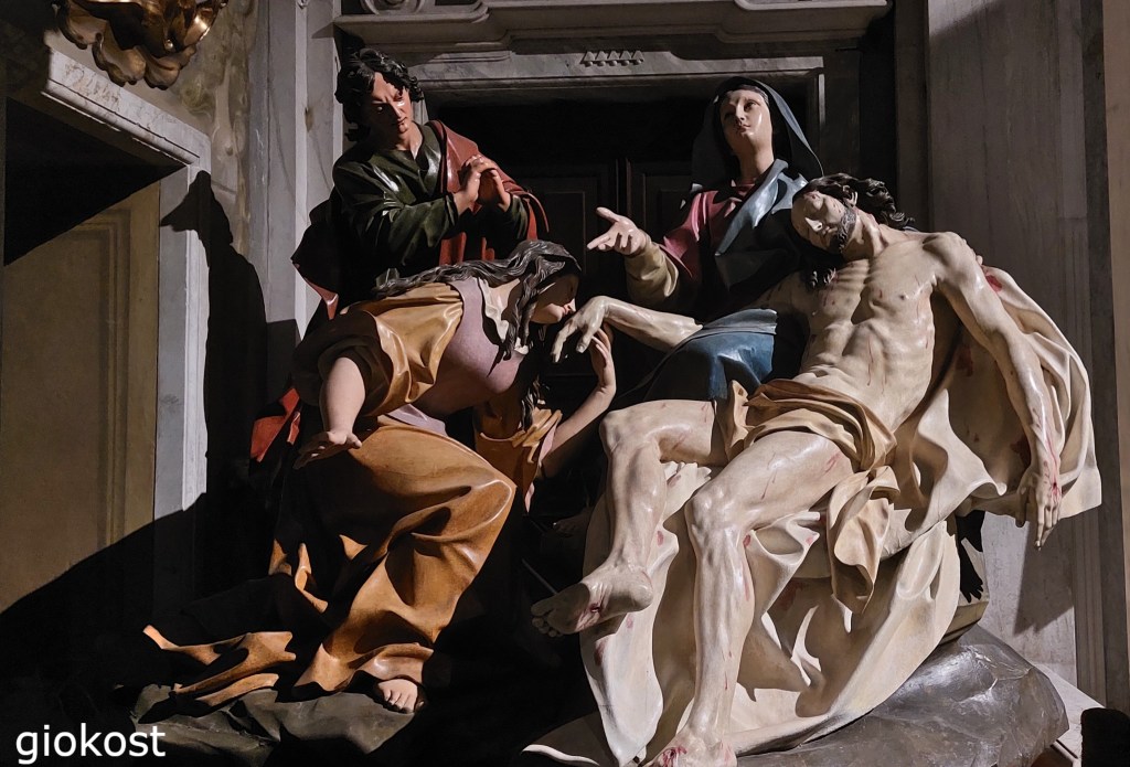 Entrando, sulla destra troviamo la Pietà di Anton Maria Maragliano, una scultura in legno restaurata da poco, osservando attentamente quest’opera si scoprono i colori vivaci delle vesti, ma soprattutto l’intensità dei visi che raffigurano il dramma e il dolore vissuto in quel momento in particolare da Maria.