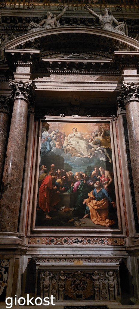 Situata nella terza cappella della navata di destra si vede Maria, avvolta in un abito candido che prende maggior risalto dalla luce che la circonda, attorniata da uno stuolo di angioletti, rivolge lo sguardo verso l’alto, si erge sorretta dalle nuvole al di sopra degli apostoli che si interrogano davanti al sepolcro vuoto. Il dipinto emana una luce straordinaria che invita alla contemplazione e alla preghiera, ma anche ad osservare i piccoli particolari come ad esempio le chiavi, i libri e il rotolo di carta vicino ai piedi di San Pietro che a braccia spalancate guarda verso il cielo. La vicina seconda cappella è impreziosita dall’opera di Simon Vouet la Crocefissione dove Gesù, illuminato dalla luce e con il volto nascosto a causa della posizione sulla croce, sembra in colloquio con il Padre. Attorno, in basso, la Vergine, San Giovanni e la Maddalena in preghiera e degli angeli affranti che piangono in alto sulla sinistra. Sotto la mensa dell’altare si scopre la Natività di Tomaso Orsolino, realizzata in marmo, verso la metà del XVII secolo, unicità per quell’epoca.